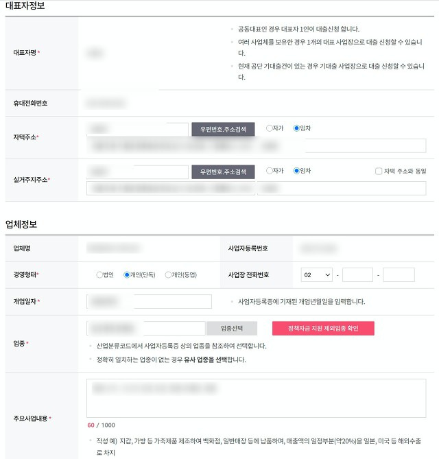 이후 대표자정보, 업체정보 등 심사에 필요한 정보를 입력합니다. 본인이 정책자금 지원 제외업종인지 확인도 가능하니 확인 하시길 바랍니다.