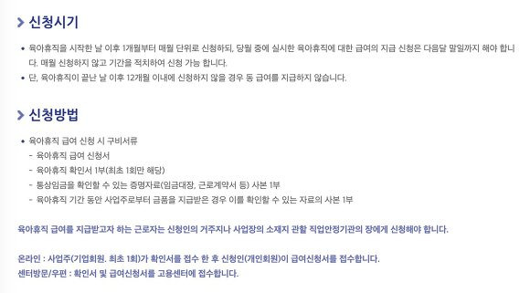그리고 신청할 때 구비서류가 있어야 하는데 육아휴직 급여신청서, 확인서, 통상임금 증명자료, 육아휴직 기간 동안 사업주로부터 금품을 지급 받았다면 확인할 수 있는 자료가 필요합니다.
