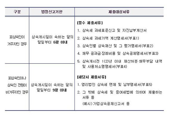 상속세 대한 법정 신고기한 및 제출서류는 다음과 같습니다.