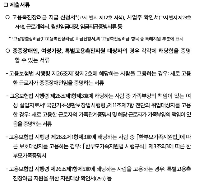 제출해야하는 서류는 고용촉진 장려금 지급 신청서, 사업주 확인서, 근로계약서, 월별임금대장, 임금지급증빙서류 등이 필요합니다.