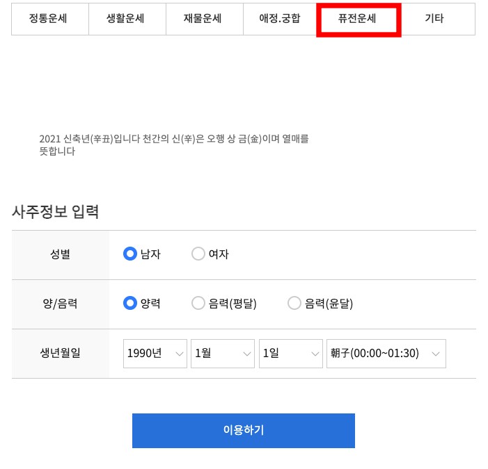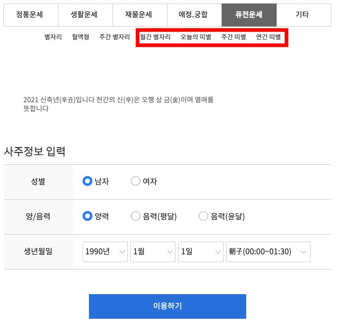해당 페이지로 접속했다면 다음과 같이 각종 운세 정보를 확인할 수 있습니다. 2021년 개띠 운세를 보기 전에 메인 페이지는 사주 정보를 입력하는 항목이 있는데요.
