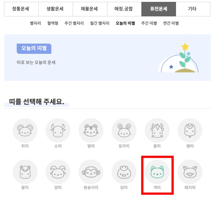 그러면 띠를 선택하는 페이지가 나옵니다. 여기서 본인이 해당하는 띠를 선택하면 되는데 저는 개띠 아이콘을 클릭하도록 하겠습니다.