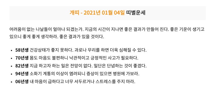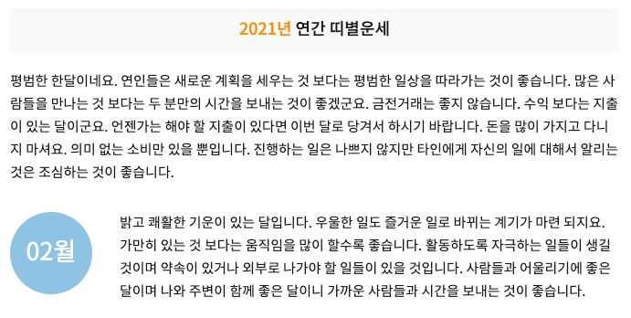 저는 매해 마다 여러 가지 사이트에서 운세를 보는 편입니다. 중앙일보, 동아일보, 뽐뿌 등 다양한 곳이 있지만 그중 특히 농협에서 제공하는 운세 정보가 가장 내용이 알차서 즐겨 보는 편입니다. 기존 글에 자세하게 작성했으니 관심 있으시면 참고하시길 바랍니다.
