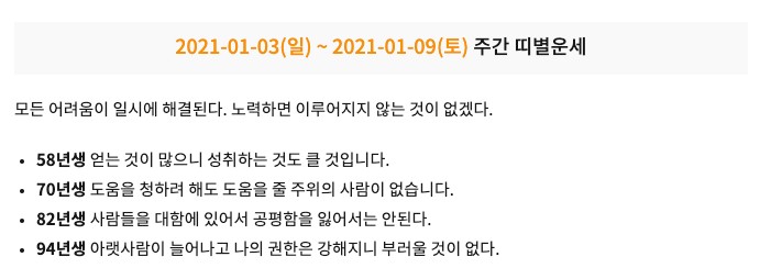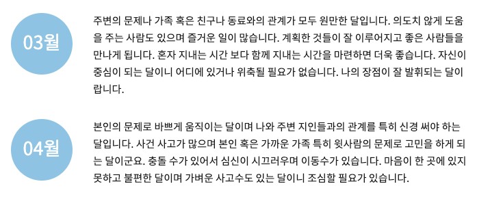 다음은 일주일 간 내용을 확인할 수 있는 주간 띠별입니다. 금일 기준으로 01월 03일부터 01월 09일 운세를 확인할 수 있습니다. 다행히 모든 어려움이 일시에 해결되지만 노력하면 이루어지지 않는 것이 없으므로 꾸준히 노력해야 할 것을 내포하고 있네요.