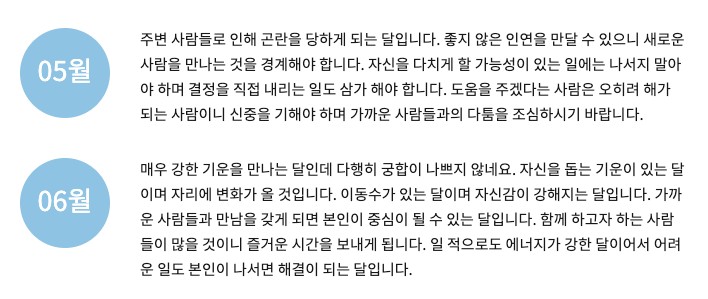 5월은 주변 사람들로 인해 곤경을 당할 수 있어 새로운 사람을 만들 때 경계해야 합니다. 그리고 본인을 다치게 할 수 있는 가능성이 있어 보이는 일은 웬만하면 지양해야 합니다.