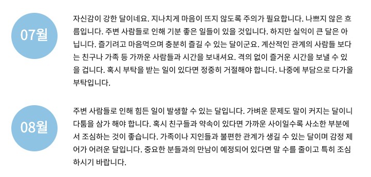 8월은 반면 주변 사람들로 하여금 힘들 수 있습니다. 가볍게 생각했던 말, 행동도 오해가 생길 수 있으며 따라서 사소한 부분도 조심하는 것이 좋습니다. 중요한 분들과 만남이 있다고 판단되면 말 수를 줄이고 행동가짐도 주의해야 하겠습니다.