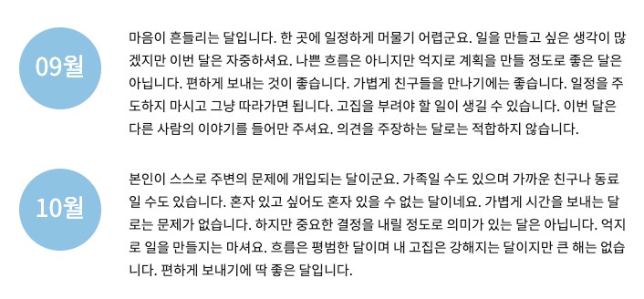 10월은 주변 문제에 본인이 의도하지 않게 개입이 되는 때입니다. 그래서 혼자 있고 싶어도 혼자 있을 수 없는데 가볍게 시간을 보내는 편이 좋겠습니다. 마찬가지로 억지로 일을 만들지 말고 평탄하게 보내는 것이 좋습니다.