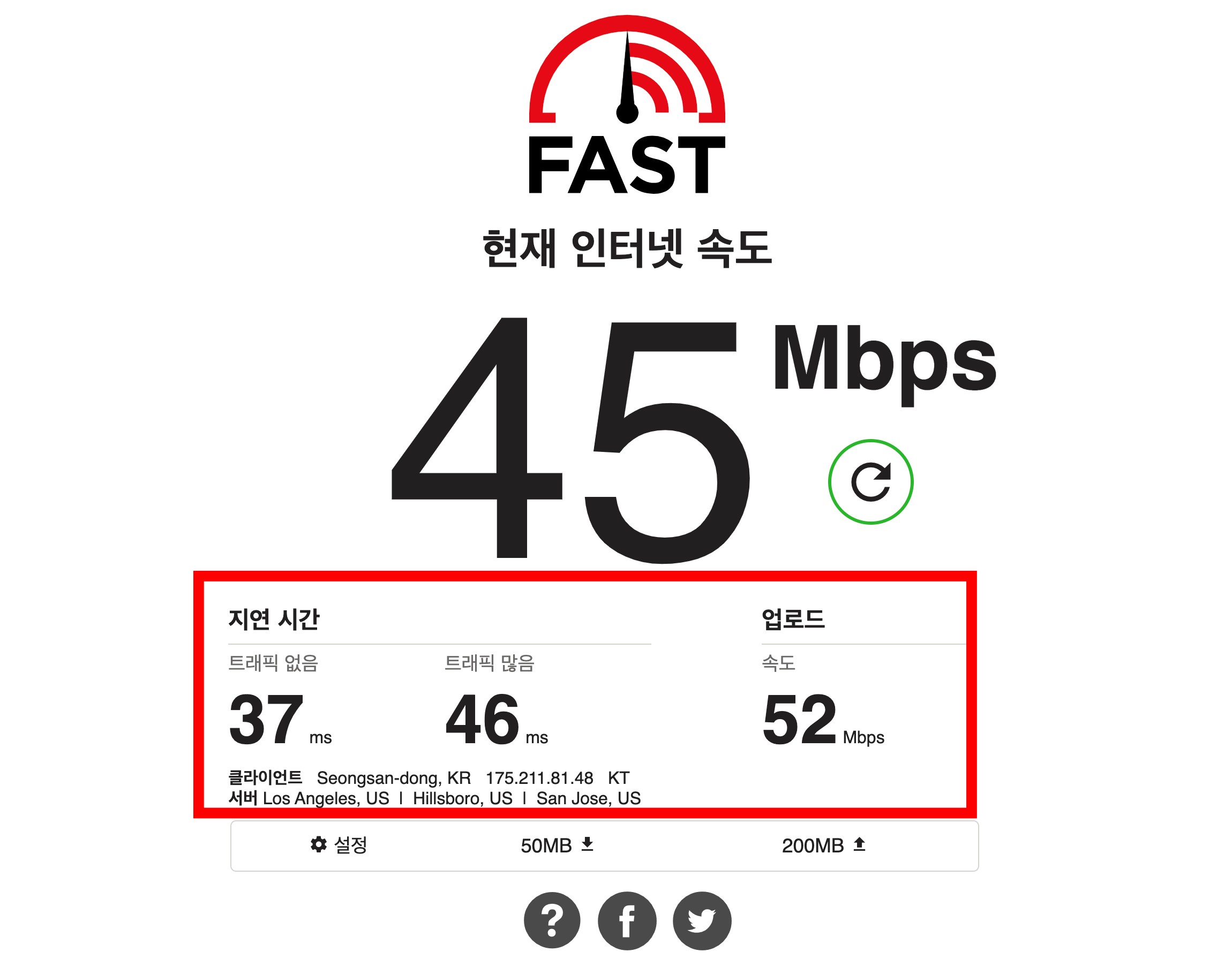 저의 경우는 52 Mbps로 적당한 수치가 나왔네요. 대체로 업로드 속도는 느린 편인데 다운로드보다 높게 측정되었어요. 마찬가지로 환경마다 조금씩 결과가 다를 수 있기 때문에 여러 군데에서 측정 후 평균값을 확인하는 것도 방법입니다.