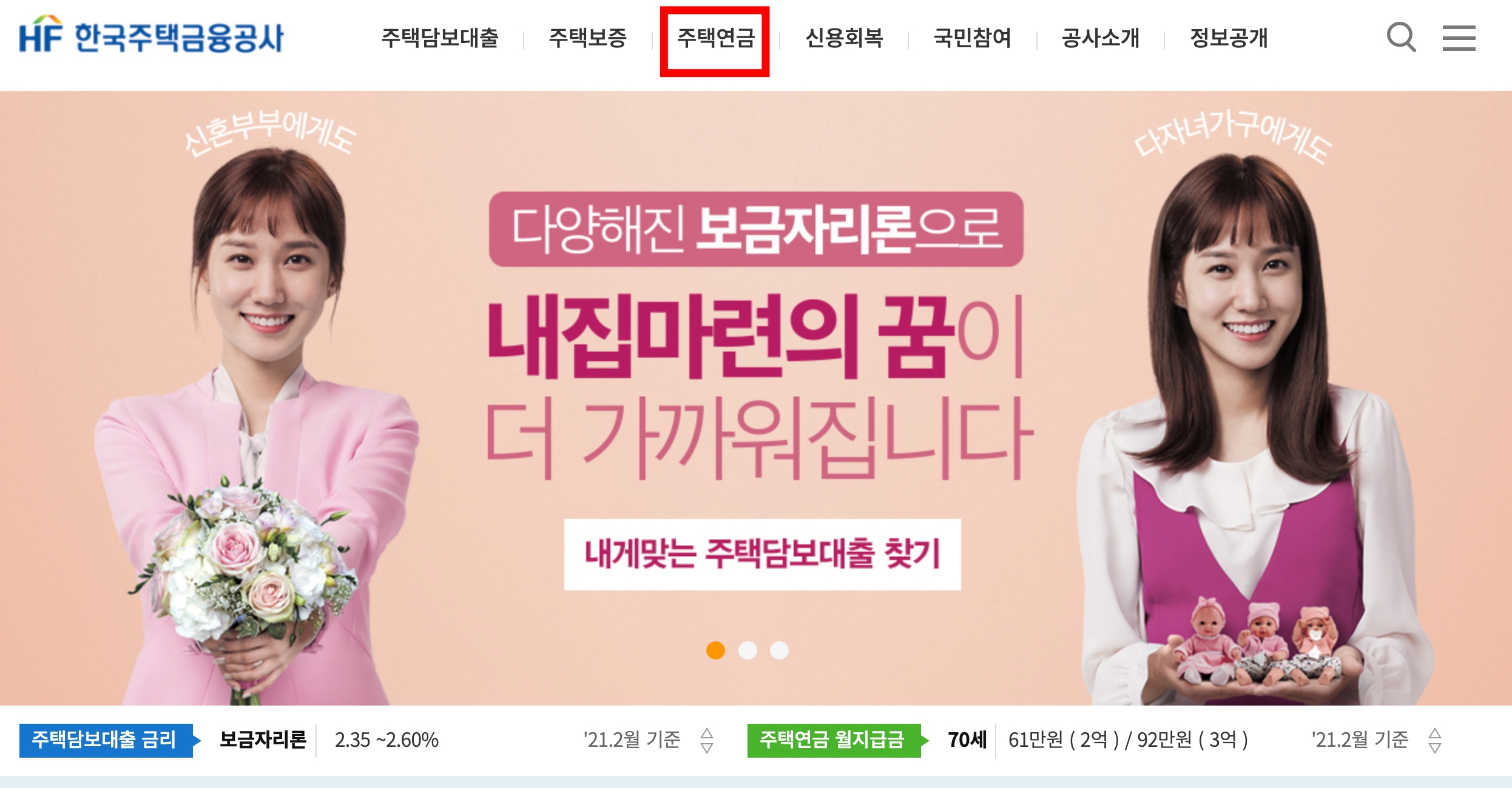 메인화면에 접속했으면 상단 [주택연금] 항목을 확인하여 클릭합니다.