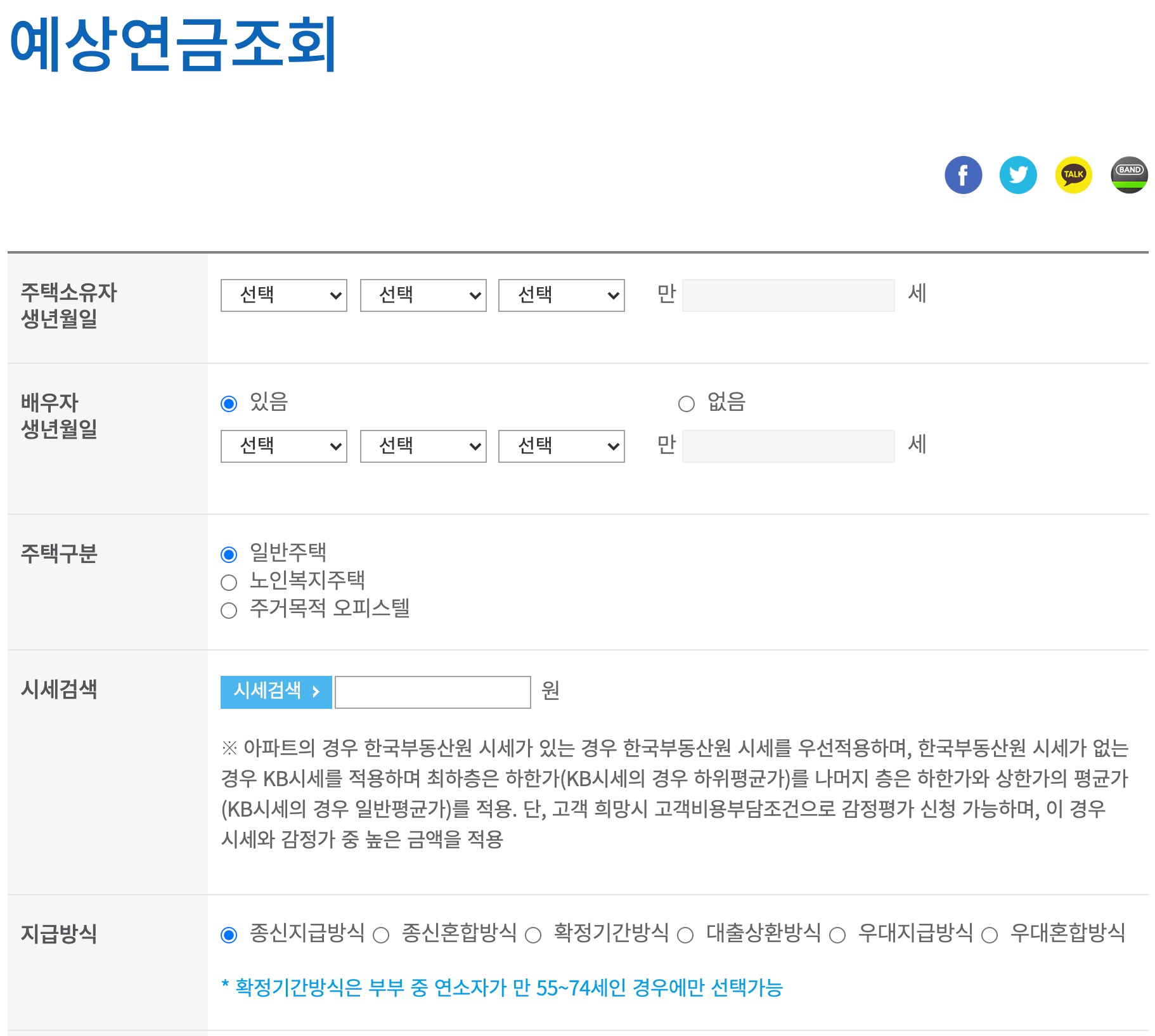 여기서 주택소유자 및 배우자 생년월일, 주택 구분, 시세, 지급방식 등을 입력 및 선택하면 조회할 수 있습니다.
