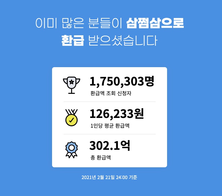 게다가 2월 기준으로 총 환급액이 302.1억이나 된다고 하는데요. 그만큼 찾지 않고 묵혀 두었던 환급금이 어마어마했음을 알 수 있습니다.