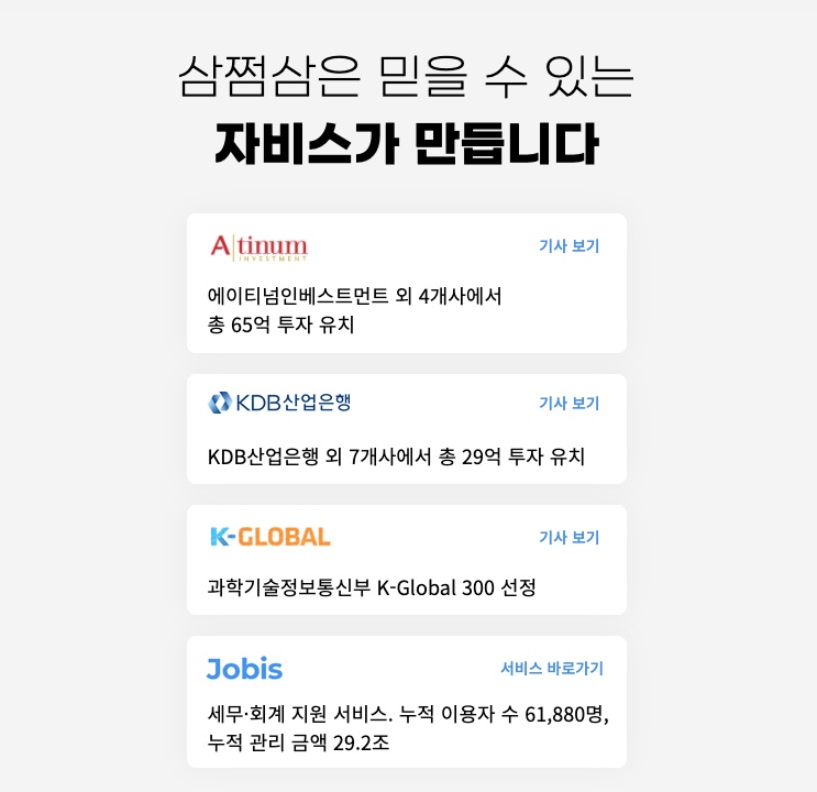 그렇다고 무턱대고 나의 개인정보와 홈택스 로그인 정보를 함부로 넘길 순 없을 겁니다. 다행히 삼쩜삼은 믿을 수 있는 자비스 회사에서 만든 플랫폼입니다. 이미 여러 금융사에서 투자 유치를 받고 있는 곳이라 믿고 안전하게 이용할 수 있습니다.