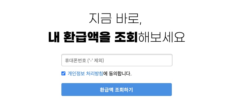 스크롤을 내리다 보면 휴대폰 번호를 적는 곳이 있습니다. 정보를 입력한 후 [환급액 조회하기] 버튼을 눌러 줍니다.