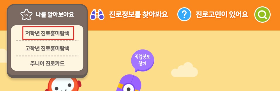 가장 먼저 진행해야될 메뉴는 ‘나를 알아보아요’ 입니다. 위 사진에 보이는 것 처럼 흥미탐색의 경우 저학년과 고학년으로 수준에 따라 서로 다른 프로그램을 진행할 수 있는데요. 저학년은 로그인 없이 바로 시작 가능하지만 고학년은 회원가입하여 로그인 후 이용 가능하므로 참고해 주세요.