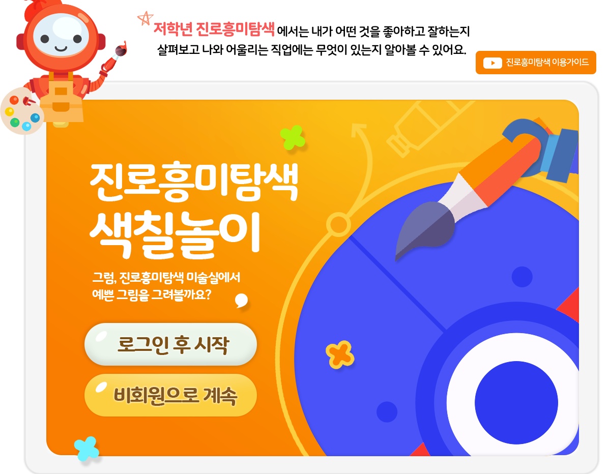 우선 저학년 진로흥미탐색 화면으로 간단하게 안내드리겠습니다. 본 메뉴에서는 내가 좋아하는 것과 그에 따라 어울리는 대표적인 직업군이 무엇인지를 추천해 주더라고요. 검사는 아이들 수준에 맞춰 색칠 놀이를 통해 알려주므로 지루하지 않게 탐색할 수 있다는 점이 좋아 보였습니다. 그뿐만 아니라 앞으로 어떤 공부를 집중적으로 해야할지 조언 또한 얻을 수 있기 때문에 내재되어 있는 잠재 능력을 끌어낼 수 있지 않을까요?