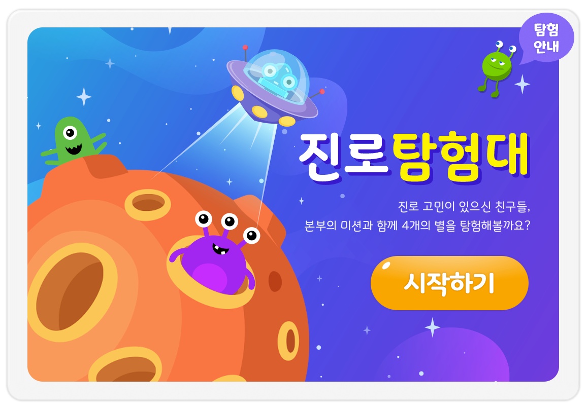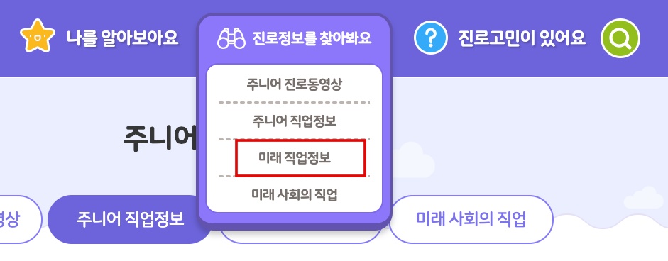 본 프로그램에서는 흥미탐색 / 진로활동 / 직업정보 / 고민해결 이렇게 4가지 메뉴로 나눠지는데요. 그 전에 3가지의 카테고리가 있습니다.