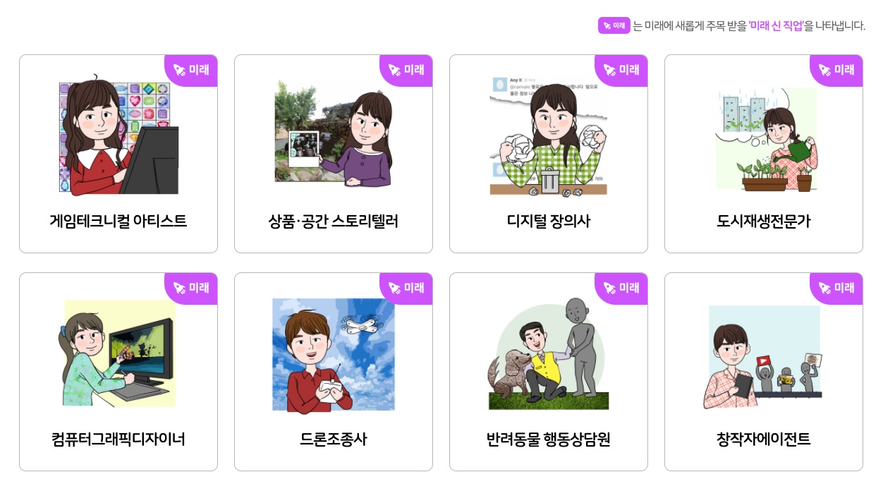 나의 성향에 맞는 직업군 외에도 전망적인 게임테크니컬 아티스트나 드론조종사, 창작자에이전트 등 미래 직업정보에 대한 자료가 여럿 준비되어 있습니다. 아무래도 4차 산업이 발달된 디지털 시대이다 보니 예전엔 볼 수 없었던 정보들이 눈에 띄는군요. 물론 현재에 맞춰진 직업 정보도 있으며 맞춤형 상담도 제공되어 있기 때문에 성인 분들도 참고하시면 좋을 것 같습니다.