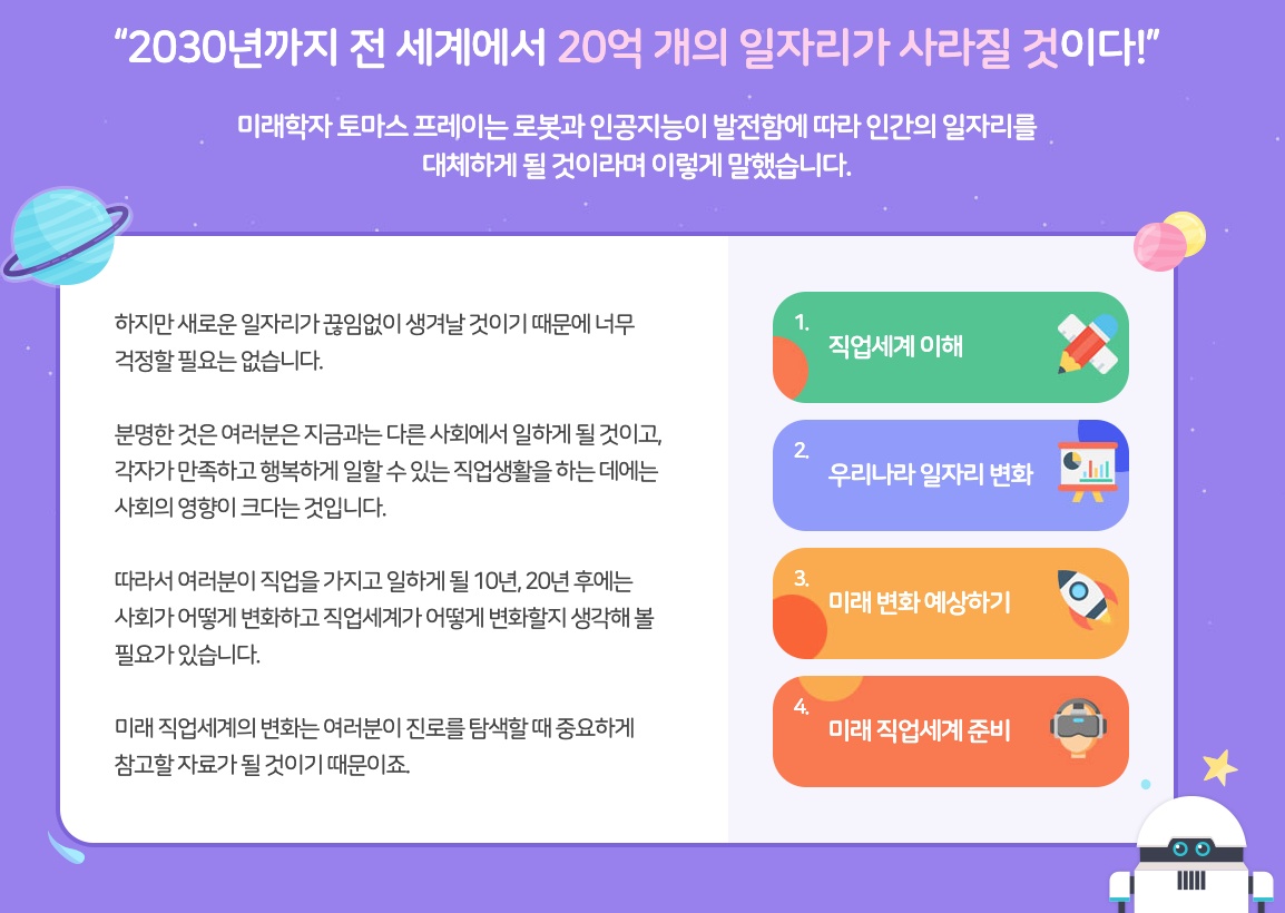 마지막으로 미래 사회를 예측해 본 주니어 커리어넷의 콘텐츠 내용인데요. 2030년까지 전 세계에서 20억 개의 일자리가 사라질 것이라고 예상한 미래학자 토마스 프레이의 내용처럼 이제는 현재를 바라보기 보다 미래를 보며 꿈을 결정해야 합니다. 앞으로 닥처 올 곤란한 상황을 대비하여 사회의 변화와 직업 세계의 변화 탐색을 예상할 수 있게끔 우리 아이들을 위해 미리 적성과 흥미를 찾아 인도해 주는 것이 도움이 되겠죠?