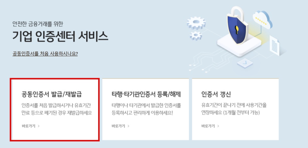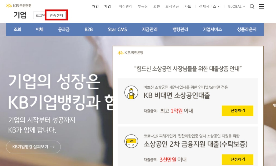 인증센터 접속 시 개인용이 아닌 기업용인지 꼭 확인하신 다음 진행해 주시길 바랍니다.