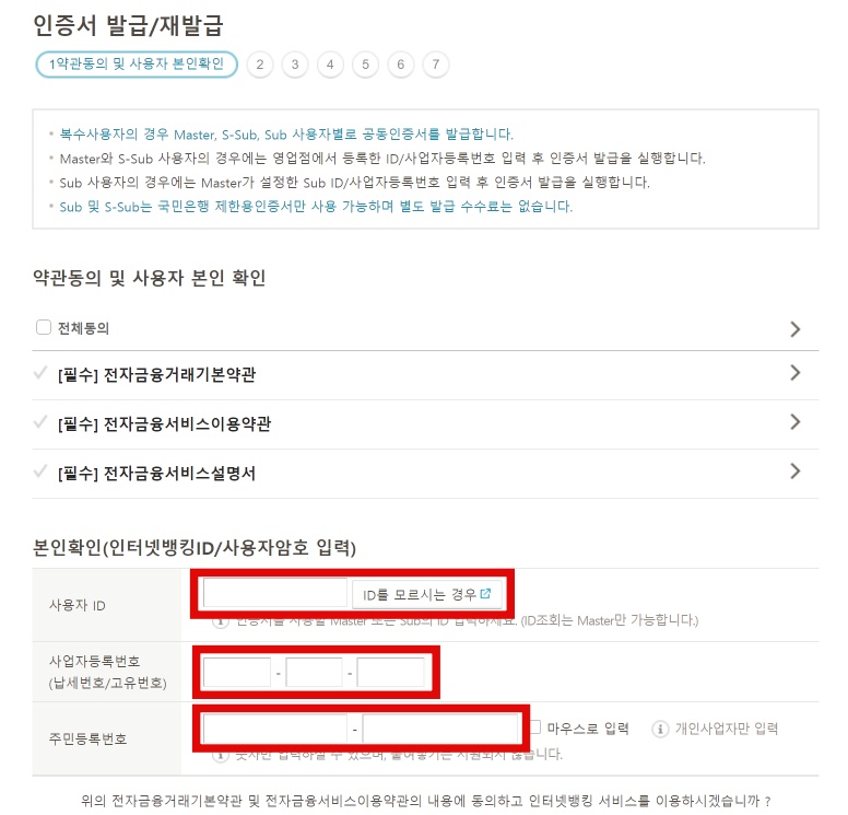 이번 포스팅에서는 국민은행에서 전자세금계산서 공인인증서 발급받는 방법에 대해 공유해 보려고 하는데요. 국민은행을 이용할 경우 이용자의 아이디와 사업자등록번호, 주민등록번호가 필요하므로 타은행을 이용하고 계신 분들은 해당 은행의 인증센터로 접속하시면 되겠습니다. (순서는 같음)