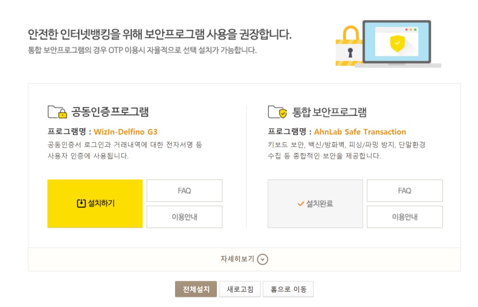 안전을 위해 프로그램 설치는 필수입니다. 가급적이면 통합 보안 프로그램으로 선택하시어 전체 설치를 하시길 바라요.