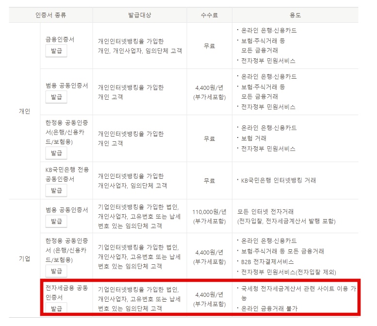 참고로 사업자 범용공동인증서가 더 쓰기 좋은 거 아닌가요?라고 생각하시는 분들도 계실 텐데요. 전자세금계산서 공인인증서 발급 수수료는 1년에 4,400원이며 범용의 경우는 110,000원이다 보니 세금계산서 발행이 목적이라면 제가 알려드리는 방법으로 먼저 진행하시는 것이 더 경제적일 듯합니다.