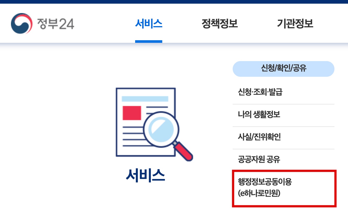 - 검색 엔진창에 정부24 검색 후 메인 상단 서비스 부분에서 ‘행정정보공동이용(e하나로민원)’ 클릭