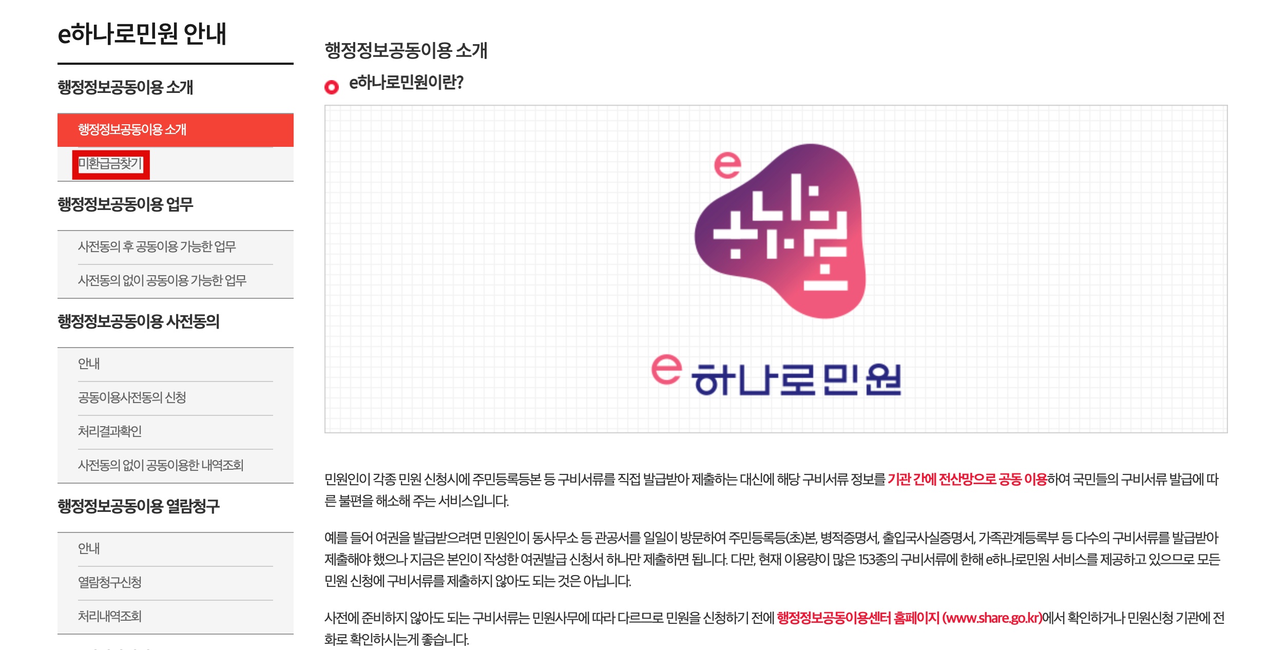 - ‘행정정보공동이용 소개’ 목록에서 ‘미환급금찾기’를 선택하고 아래쪽 이용절차 부분에 있는 내용 클릭