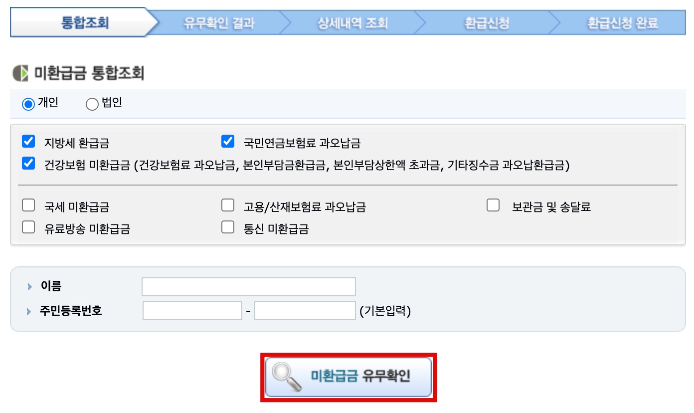 - 국세환급금 조회에서 개인 또는 법인을 체크한 다음 항목을 선택, 이름 및 주민등록번호 기입