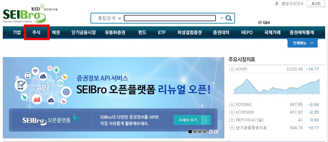 1. SEIBro에 접속하시면 위 사진과 같은 화면을 마주할 수 있습니다. 회원가입 및 로그인이 필요하지 않으니 바로 상단 메뉴 중 주식 메뉴를 선택하여 클릭해 주세요.
