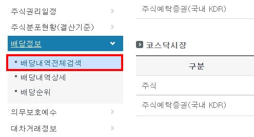 2. 해당 메뉴 클릭 후 페이지가 넘어가면 다시 좌측에 있는 메뉴 중에 배당정보를 클릭한 다음 빨간 네모 박스에 표시되어 있는 전체검색을 클릭합니다.