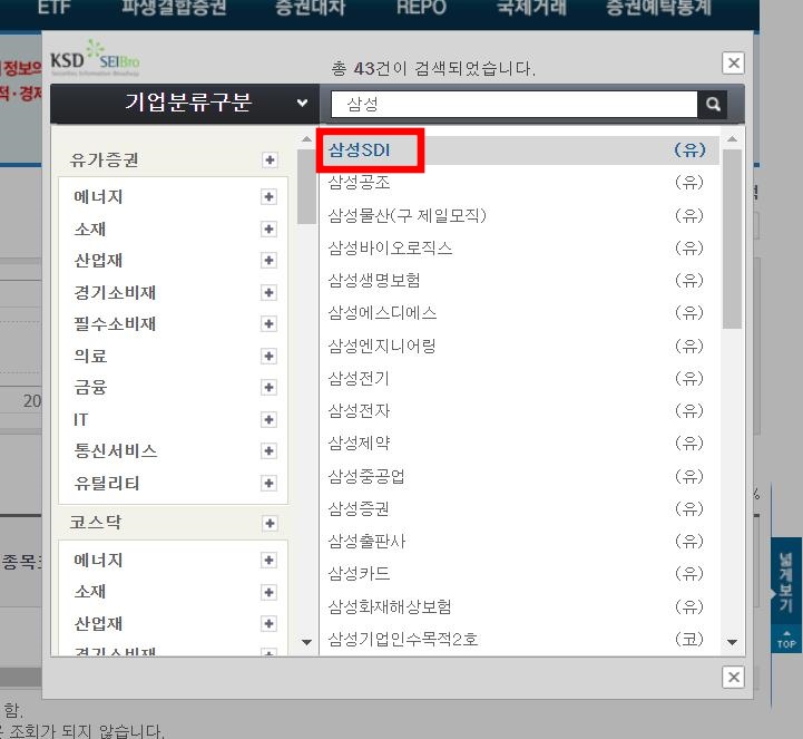 해당 내용에 대한 정보는 증권 정보 포털 사이트인 SEIBro에서 확인 가능합니다. 아마 링크에 접속하여 확인해 보시면 아시겠지만 다양한 종목들을 한눈에 볼 수가 있는데요. 우선 저는 예를 들기 위해 임시로 삼성SDI를 기준으로 설명드려 보겠습니다.