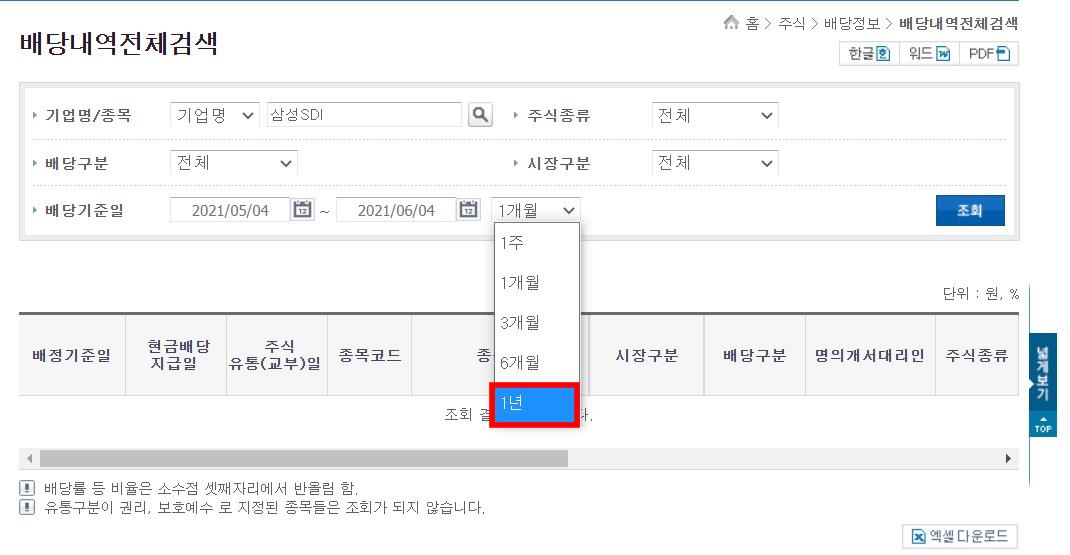 여기서 주의하셔야 할 점은 기준일 기간을 1년으로 변경하여 조회하셔야 된다는 점입니다.