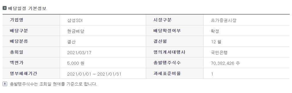 지급일은 주총 결의일로부터 1개월 이내에 지급하기로 되어 있습니다. 삼성SDI의 총회일은 2021년 3월 17일이었는데요. 물론 종목마다 주주총회 날짜가 다르니 주총 결의일이 언제인지 미리 확인하면 대략 언제쯤 지급받을 수 있는지 알 수 있을 겁니다.