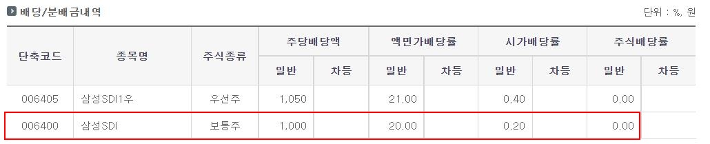 그러면 위 사진에 나와 있는 것처럼 해당 종목에 대한 기본정보가 여러 항목으로 구분지어 나오게 되죠. 삼성SDI 보통주의 기준 액면가는 5,000원에 현금배당 1,000원이라 배당률 비율을 20%로 확인할 수 있었습니다. 지급일과 기준일은 다트 전자공시 사이트에서 따로 확인 가능하세요.