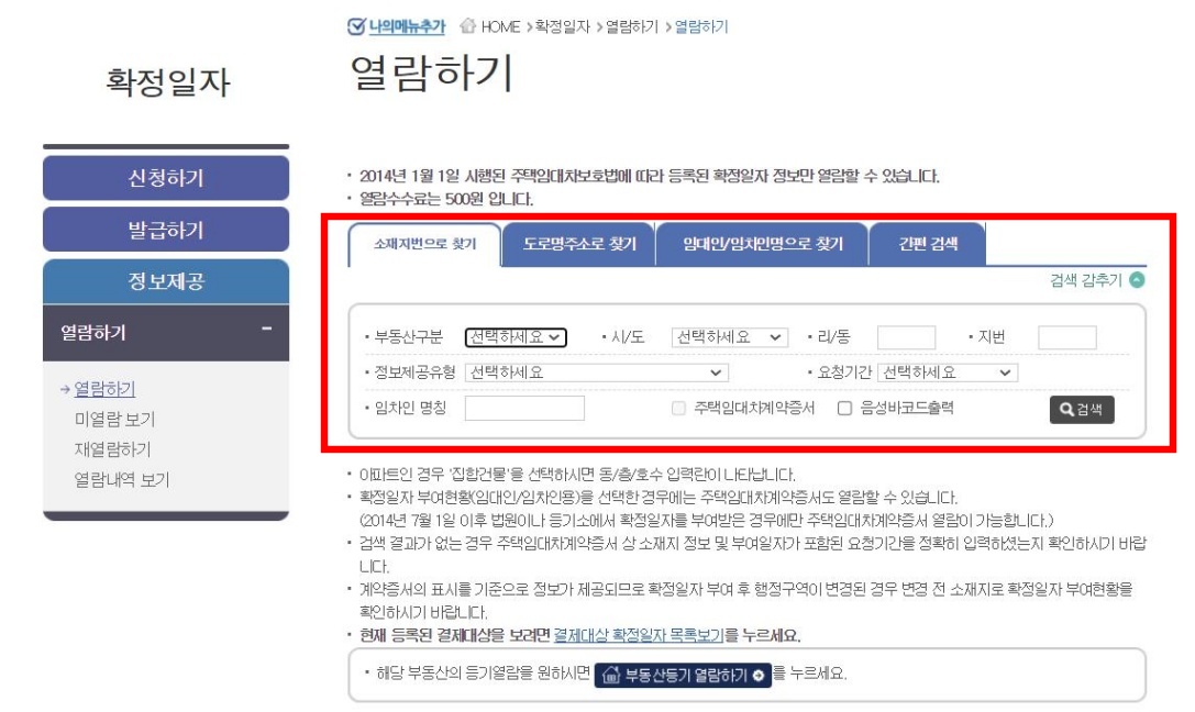 위 화면에서 해당 소재 지번을 입력하여 열람하시면 끝입니다. 지번뿐만 아니라 도로명주소, 임대인/임차인 성명을 통해서도 등록 여부를 확인할 수 있는데요. 그러나 이렇게 온라인으로 열람하는 것은 단순하게 확인하는 용도이기 때문에 실질적인 내용을 볼 수 있긴 하지만 관공서 제출서류로서의 법적 효력은 없습니다. 이 점은 참고해 주시고요. 관공서 제출 또는 은행에 제출할 문서를 출력하기 위해서는 직접 주민센터에 방문하여 발급받으시면 됩니다.