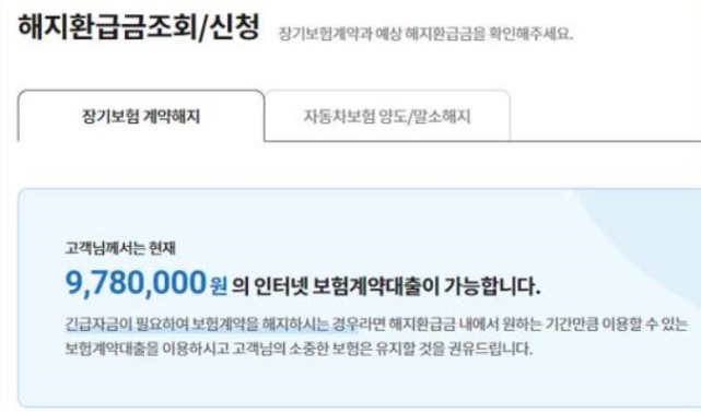 신청 방법은 간단합니다. 앞서 설명드린 것처럼 해지 환급금 조회 메뉴에 진입하면 아래에 보험계약대출 가능 금액이 나오는데요. 그 옆에 신청 버튼을 클릭하면 인터넷 상에서 바로 신청 절차를 진행합니다. 그리고 필요한 금액을 입력하고 공인인증서로 인증하면 송금까지 빠르게 진행되더라고요. 참고로 저는 환급금이 1천6백만 원 정도였으며 한도는 978만 원입니다. 대략 61% 정도 나온 것 같아요. 이 부분은 가입 상품에 따라 신청자의 신용도에 따라 상이하므로 환급금 조회 후 신청해 보시는 것을 추천드립니다.