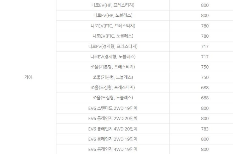 다음은 니로와 쏘울, EV6 모델이 속해 있는 기아 브랜드 현황입니다. 6백만 원 대부터 최대 금액인 8백만 원까지 다양하게 분포되어 있는 모습입니다. 참고로 차량 트림 모델에 따라 금액이 상이하므로 해당되는지 잘 확인해 보고 구매하시는 것이 중요합니다.