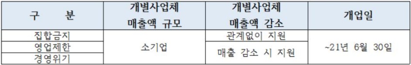 - 집합금지 – 방역조치로 인해 집합금지를 이행한 업체, 최소 300만 원에서 최대 2천만 원까지 지원하며 6주 이상이면 장기, 6주 미만인 경우 단기로 분류한다.(수도권 기준 장기 : 유흥시설 5종, 홀덤펍, 노래연습장, 실내 스탠딩 공영장, 실내체육시설, 실내집단운동시설, 대형학원 등 / 단기 : 직업훈련기관, PC방, 독서실 및 스터디카페, 뷔페, 파티룸, 교습소, 겨울 스포츠 시설 등)