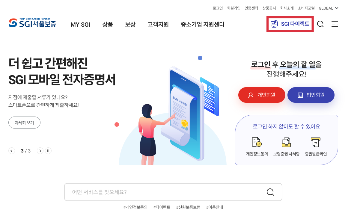 여기서 말하는 신용도란 신용카드 사용 내역, 대출 이용 내역 등을 의미 합니다. 다음으로 발급 받을 수 있는지 확인하기 위해서 SGI서울보증 공식 홈페이지 접속하여 보험가입을 클릭 하면 확인하면 되는데요.