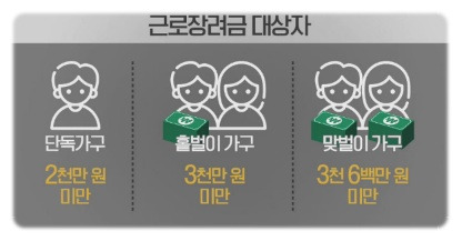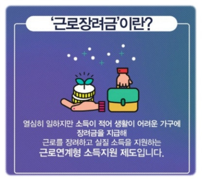 근로장려금은 꾸준히 일은 하고 있지만 소득 수준이 어려워 생활 유지가 힘든 근로자, 종교인 혹은 사업자 가구를 대상으로 시행한다. 가구 구성원 및 총급여액 등에 따라 산정이 된 근로장려금을 지급하여 근로를 장려할 수 있으며 실질소득을 높이고 지원할 수 있는 근로연계형 소득지원 제도이다.